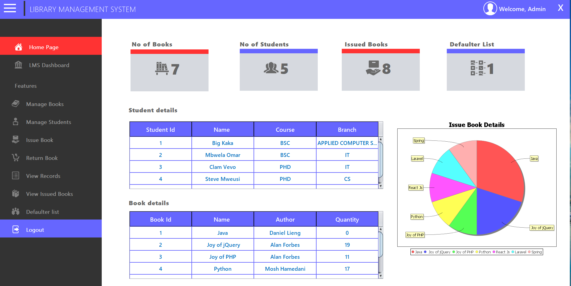 This is unique management system that is built up using JFrame in Java. It play various major role as shown in this homepage diagram. Admin can manage books and students that's ADD, UPDATE and DELETE. He can issue book and he can also be able to see how many books have been issued, returned and those one that have not been returned and he can as well see how many books are there in the library. Finally one can see issued books throuh pie chart and one can signup in order to access library.
